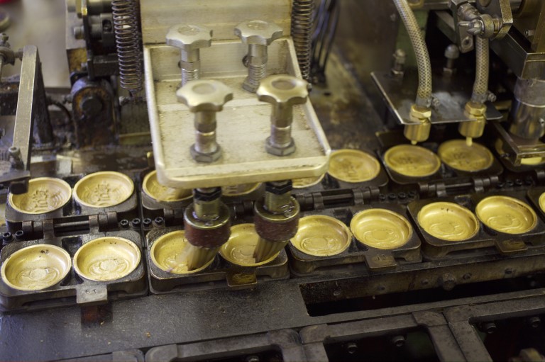 Automatic brushes coat the molds with oil.
