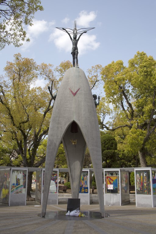 The statue atop the memorial is of Sadako Sasaki 佐々木 禎子 a young girl, who while suffering from leukemia, believed that if she folded 1,000 paper cranes she would be cured.