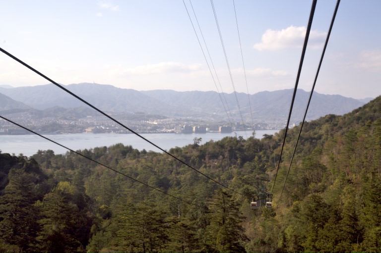 Mt. Misen is approx 530m high so it affords great views of the Inland Sea. Here we can see a view of Miyajima-guchi.